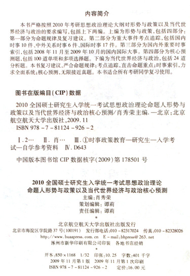 全国硕士研究生入学统一考试思想政治理论命题人形势与政策以及当代世界经济与政治核心预测(新大纲最新版)/2010肖秀荣考研书系
