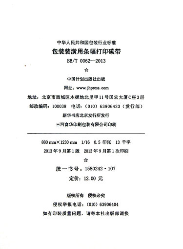 包装装潢用条幅打印碳带(BB\T0062-2013)/中华人民共和国包装行业标准