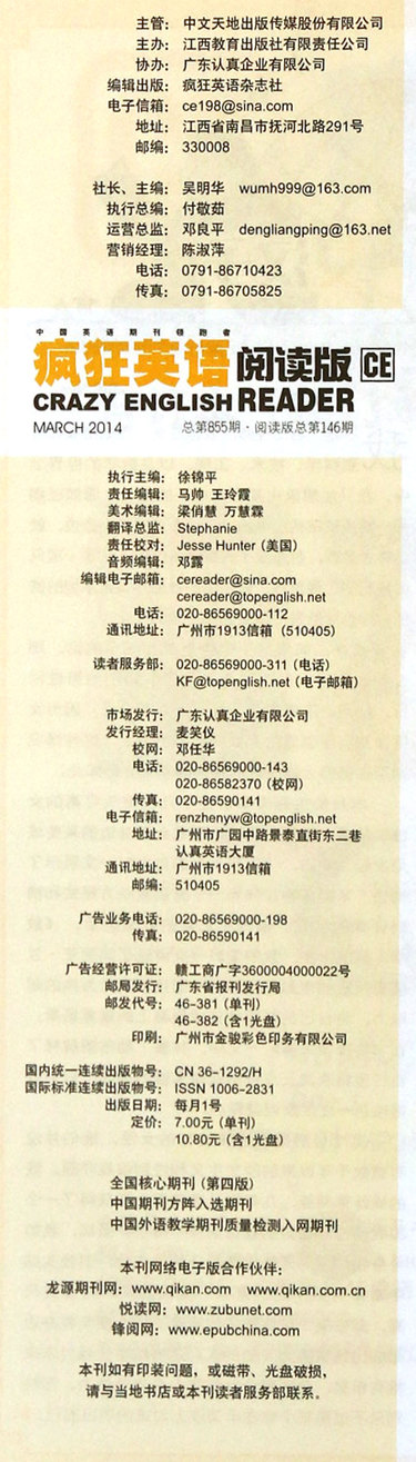 疯狂英语阅读版(附光盘2014年3月总第146期)