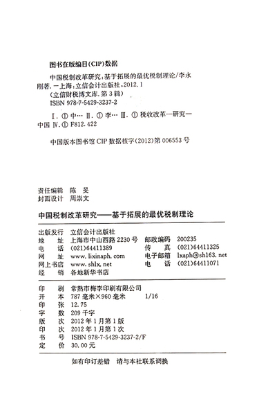 中国税制改革研究--基于拓展的最优税制理论/立信财税博文库