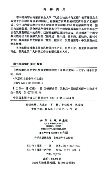 自然发酵乳制品中乳酸菌生物多样性/华夏英才基金学术文库