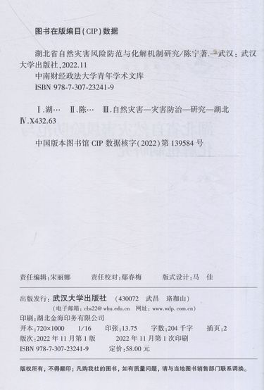 湖北省自然灾害风险防范与化解机制研究/中南财经政法大学青年学术文库